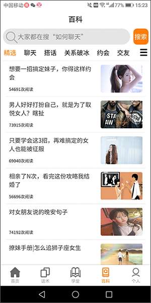 3、切换到百科界面,里面会有很多关于恋爱的优质知识供大家学习。