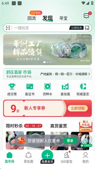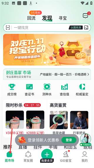 2、逛市场页有一键找货、以图找货功能,展示双11挖宝活动,还有成交榜、查证书等服务入口,提供限时秒杀、高货鉴赏板块。