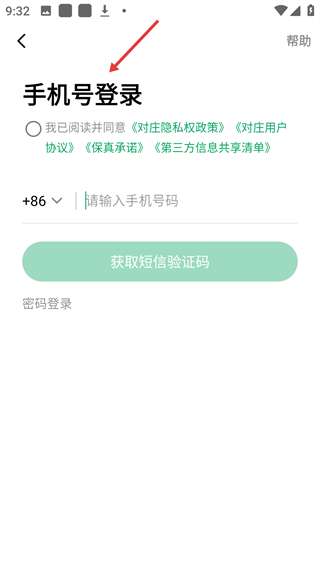 1、登录页,支持手机号登录,需勾选同意相关协议,输入手机号后获取短信验证码即可登录,也可选择密码登录。
