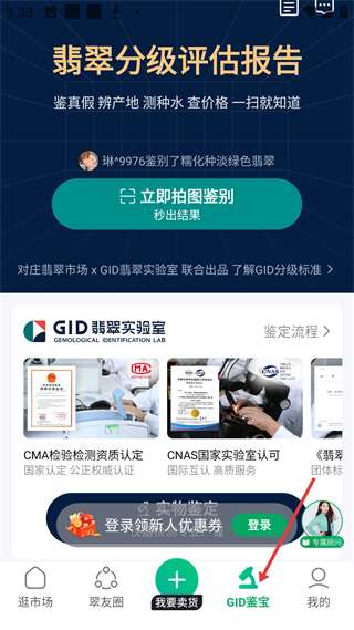 4、GID鉴宝页提供翡翠分级评估服务,可拍图鉴别翡翠真假、产地等,由对庄与GID实验室联合出品,具备CMA、CNAS权威认证。