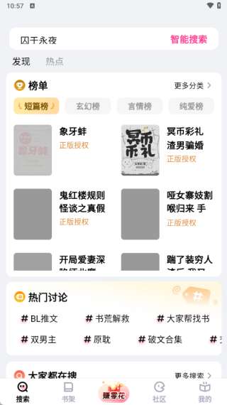 3、来到软件搜索页面,可查看短篇榜、玄幻榜、言情榜、纯爱榜等功能。