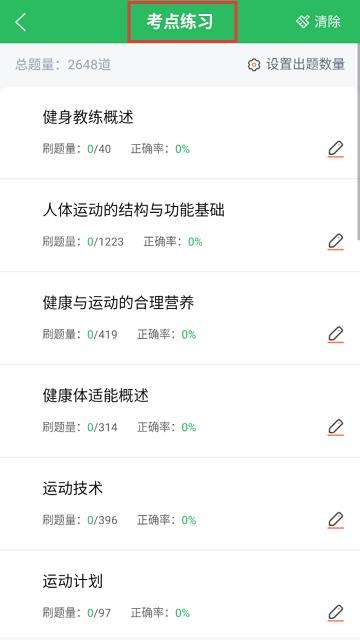 1、界面展示健身教练备考题目情况,分多个考点模块,方便考生针对不同考点进行练习。