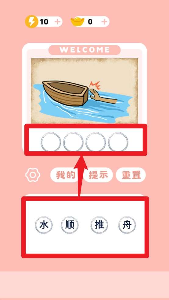 1、根据图片提示选择成语,需依照顺序点击下方文字组成正确答案,如“顺水推舟”。