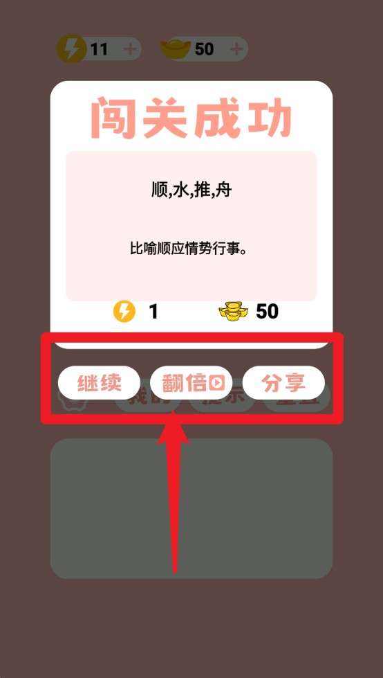 2、通关界面显示成语释义,用户可选择继续下一关、翻倍奖励或分享内容。