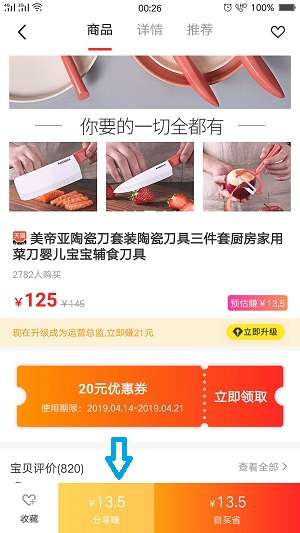 1、打开软件找到对应的优惠券商品,有时候同样一款商品,不同的店铺给的优惠券额度不同,大家可以挑选一下,优先选择大额优惠券分享,如下图选好了一套刀具,有20元优惠券,这个券是分享给朋友的;在左下角还可以看到“预估赚13.5元”,好友成交后你就可以拿到这13.5元奖励了。