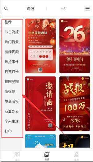 4、模板区域按目的和风格对所有设计资源进行系统分类,使用户易于快速浏览和选择合适的设计框架。
