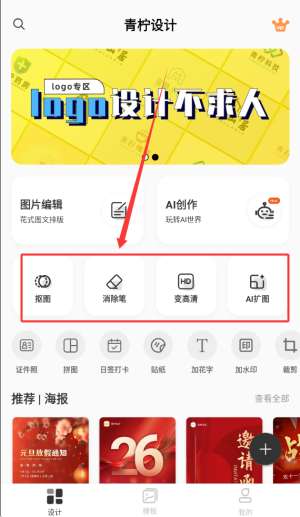 3、设计部分集成了多种智能图像处理工具,包括智能图像裁剪、碎屑去除、笔划质量高清恢复和AI智能图像扩展功能。