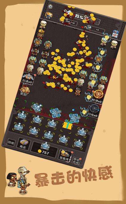 1、点击自动合成机甲升级之后僵尸一出现他们就会开启攻击,不断的射杀僵尸,你就能够获得金币了然后去商店里购买解锁更多高级的机甲。