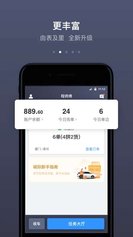2、首页提供抢单大厅、司机课堂等功能模块,司机可根据需要灵活使用多种运营工具。