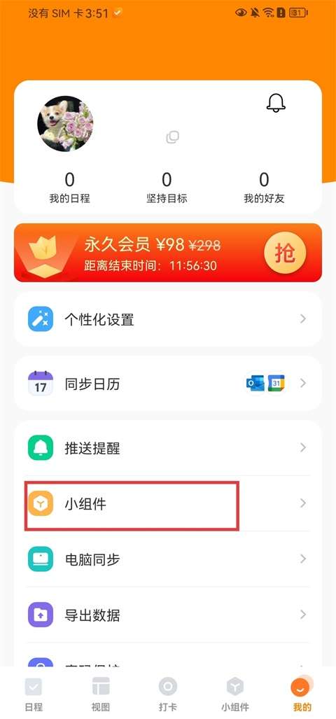 1、打开指尖时光App,进入【我的】页面,点击【小组件】选项。