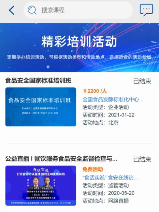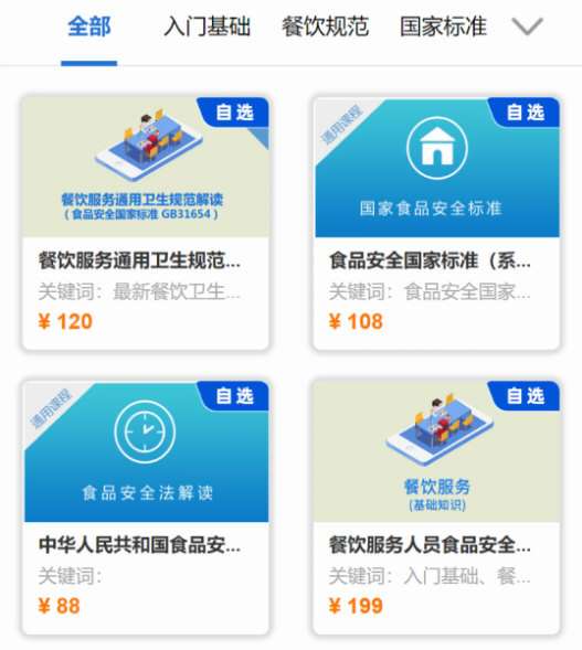 1、成功登录后,进入APP主页,可以看到课程类别导航栏,其中包括食品生产、食品流通、餐饮服务、食品安全监管等多个类别。用户可以点击相应的类别,根据自己的工作要求和学习兴趣查看课程。