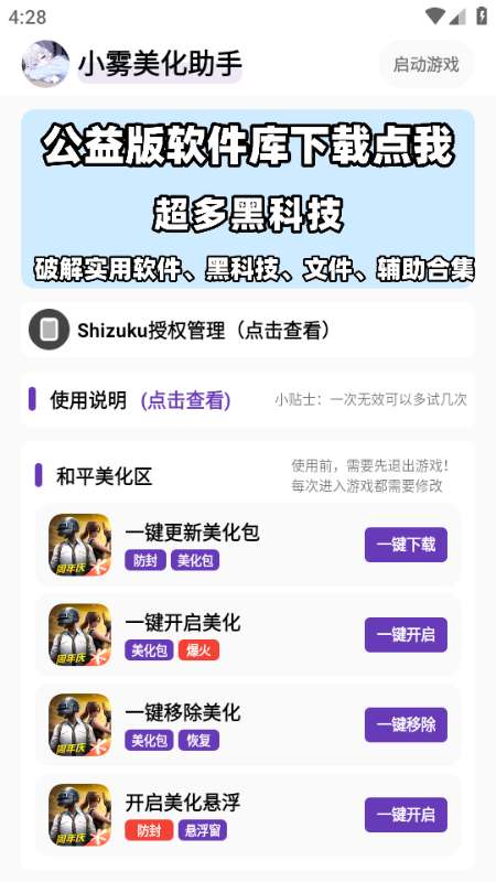 小贴士:开启美化防止启动游戏时意外闪退操作(移除美化→进入游戏,到游戏登录界面→ 退出游戏→回到"小雾美化助手"开启美化→重新进游戏即可完成美化!)(仅启动游戏出现需更新资源时执行的操作)