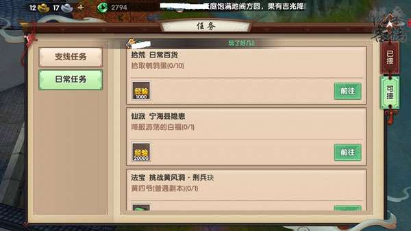 日常任务是玩家每天都可以接到的任务,分为拾荒、仙派、礼仪三种,三种任务除礼仪外都可以使用灵力完成,前期推荐使用灵力完成任务节省时间。