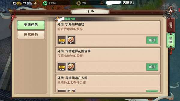 支线任务是游戏中获得经验较多的玩法之一,仙友们在进行主线任务之时,不妨仔细观察周围,会出现一些头顶带着感叹号的NPC,对话便可以接取支线任务了。