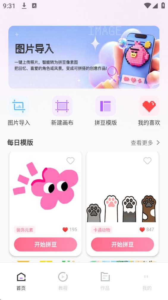 2、零基础友好,创作零门槛 支持图片导入、新建画布,可自由选择画布尺寸与配色方案,把照片一键转换成像素图纸;更有详细的视频 + 图文教程,从材料准备、基础技巧到翻车急救,手把手教你玩转拼豆!