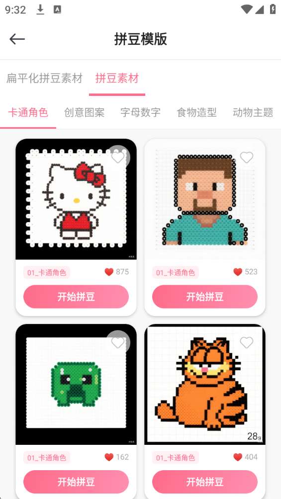 1、海量模板库,灵感永不枯竭 从卡通角色、自然风景到食物造型等场景,拼豆模板库分类齐全,热门 IP、经典形象全覆盖。一键选择 “开始拼豆”,图纸直接生成,再也不用对着空白网格发呆!
