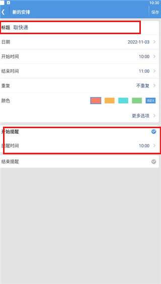 2、输入标题和提醒时间后,点击保存保存。