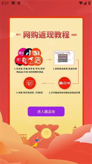 趣品味app是一个提供隐藏的网上购物优惠券和极高的网上购物折扣的软件,致力于为消费者提供简单的购物体验,使他们能够以相对实惠的价格购买到有用的产品。平台在货源上提供了非常丰富的产品种类,包括数码产品、女装、食品、美容产品、家居等,可以满足用户的不同需求。在软件设计上,采用极简主义风格。除了常用的商城功能菜单,它还提供了一些生活化的功能,如手机充值、叫外卖、购买电影票等,让用户享受便捷的生活。