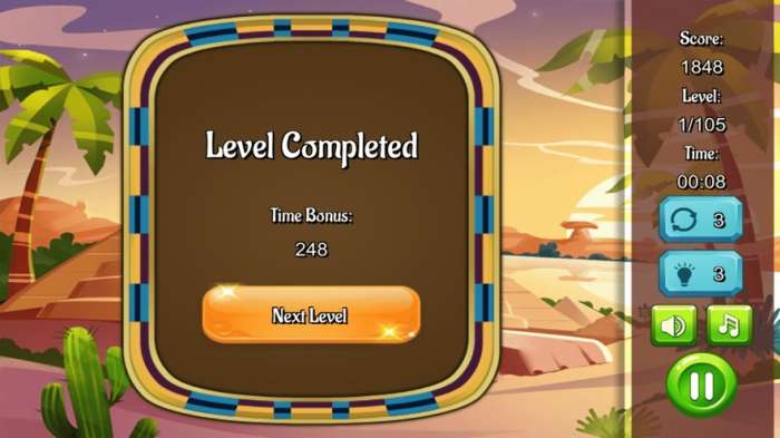 Speed Pyramid Linked这是一款埃及金字塔主题的连连看游戏,在这里大家可以看到经典的沙漠场景,以及具有那个时期金字塔建筑以及一些沙漠上的植物。在地图上面已经为大家标注好了每一个关卡挑战,按照顺序一个一个的去通关完成就可以了,每一次大家都可以解锁了很多新的通关奖励,可以去解锁一些新的道具来使用。