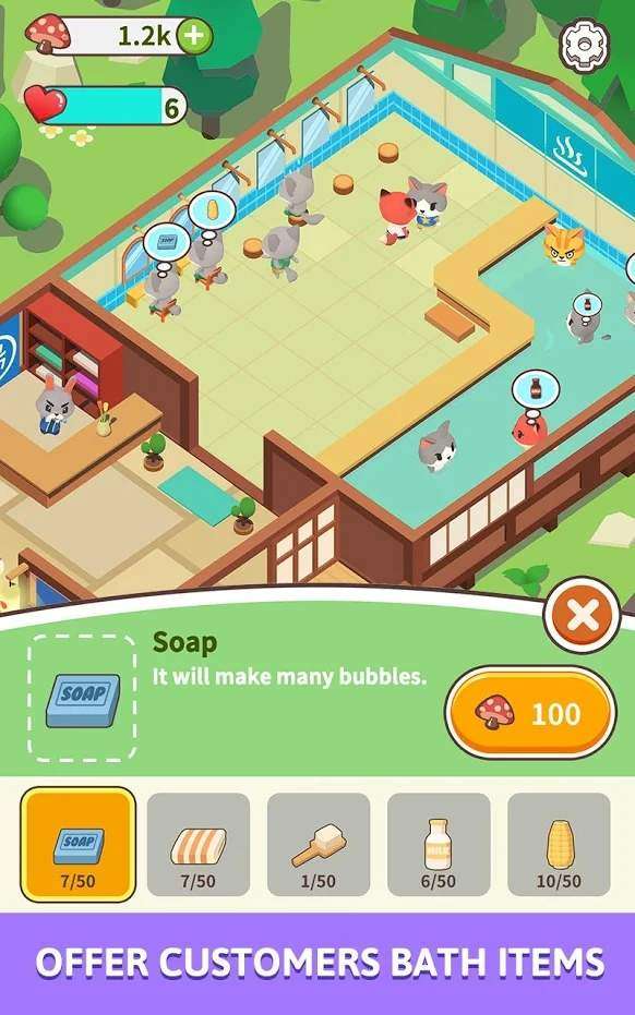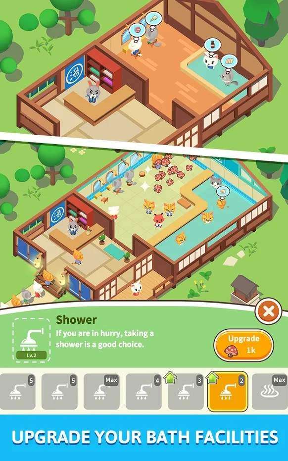 《空闲沐浴》是一款卡通风格的模拟经营游戏。在游戏中玩家将成为一间浴场的老板,为森林中的动物们提供淋浴服务。你可以通过招揽顾客来获得收益,使用金币解锁各式功能的淋浴设施提高顾客的评价,你还可以装饰自己的门面提升自己的人气,感兴趣就来下载吧。