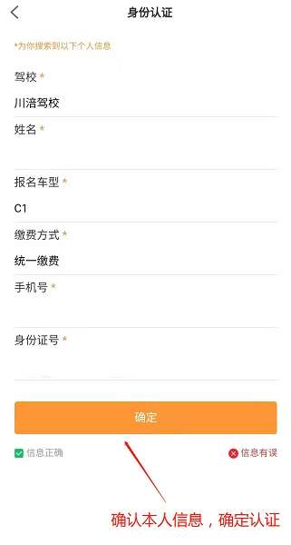2、输入身份证号码完成绑定,核对驾校信息无误后,方能确定完成认证。