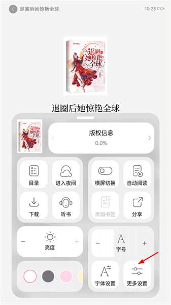 2、进入后选择一本书籍打开后,点击空白处会出现菜单,选择更多设置;