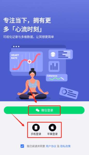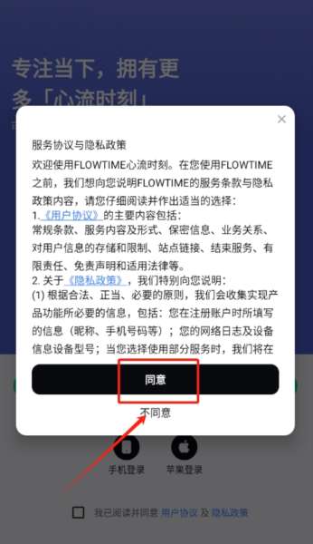 1、打开心流时刻后,会看到软件协议内容,仔细读一遍没疑问就点击同意,进入登录页面准备下一步操作。