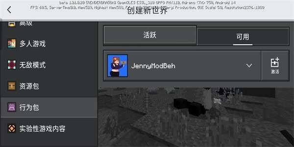8、点击设置——资源包或行为包,选择“JennyModBeh",点击激活。
