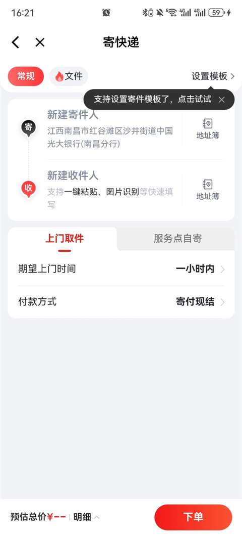 3、输入寄件人收件人形象以及取件时间后下单即可。