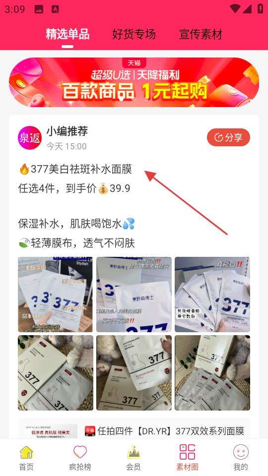 3、在素材圈精选单品页面,查看小编推荐的377美白祛斑补水面膜,了解任选4件到手价等信息,点击可查看商品详情及购买。