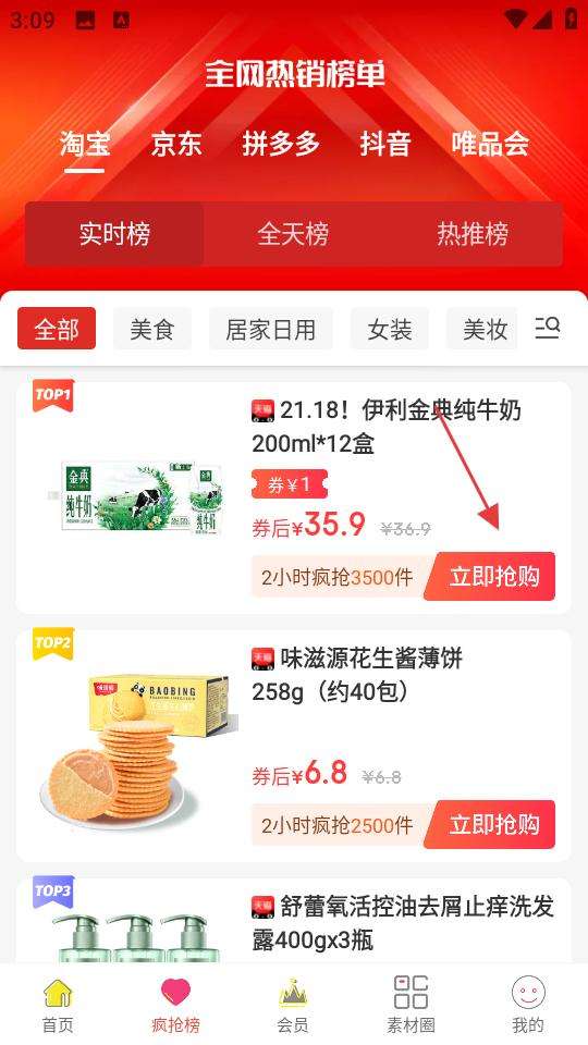 2、进入疯抢榜页面,切换淘宝、京东等平台榜单,选择实时榜、全天榜等,找到心仪商品如伊利金典纯牛奶,点击立即抢购。