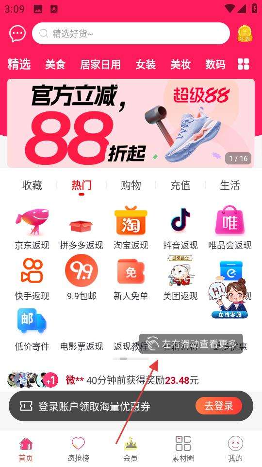 1、打开APP首页,浏览精选、美食等分类,查看热门返现功能,滑动查看更多优惠,点击登录账户领取优惠券,准备购物。