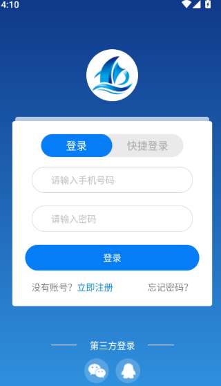 2、登录界面设账号密码输入框蓝色登录按钮醒目,下方立即注册入口方便新用户,还可切换快捷登录,需填写信息完成身份验证开启平台使用。