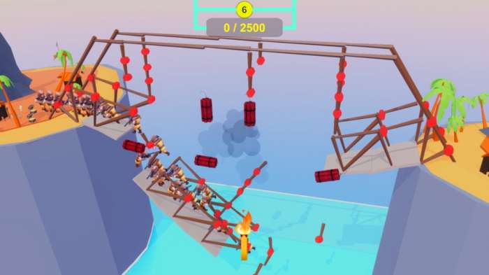 Bridge Blast 3D在这款游戏中大家是可以看到有不同的小人角色在桥上行走着,玩家们还能够看到桥上设定了一些炸弹,任务就会是把这座桥给炸掉然后开始达成上方的分数目标。整个挑战是没有时间限制的所以可以等到人数基本上都在桥上的时候点燃一个炸弹就会有连环的爆炸效果出现了,这样就可以很快的弯沉高分数的累计还有就是把敌人全部攻击解决掉。
