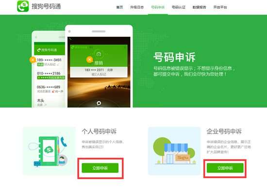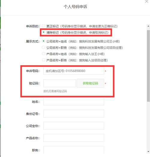 在搜狗号码申诉界面可以选择是个人号码还是企业号码的申诉。