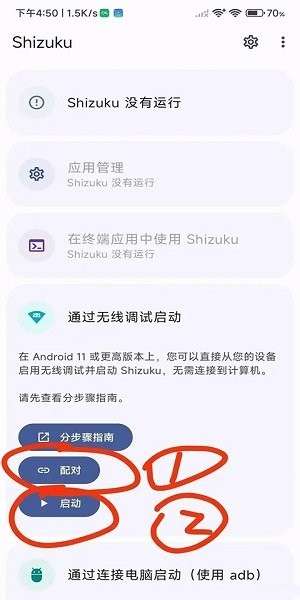 1、打开shizuku软件(没有的用户需要先下载一个),按如图所示的步骤进行配对,配对完成后,点击启动。