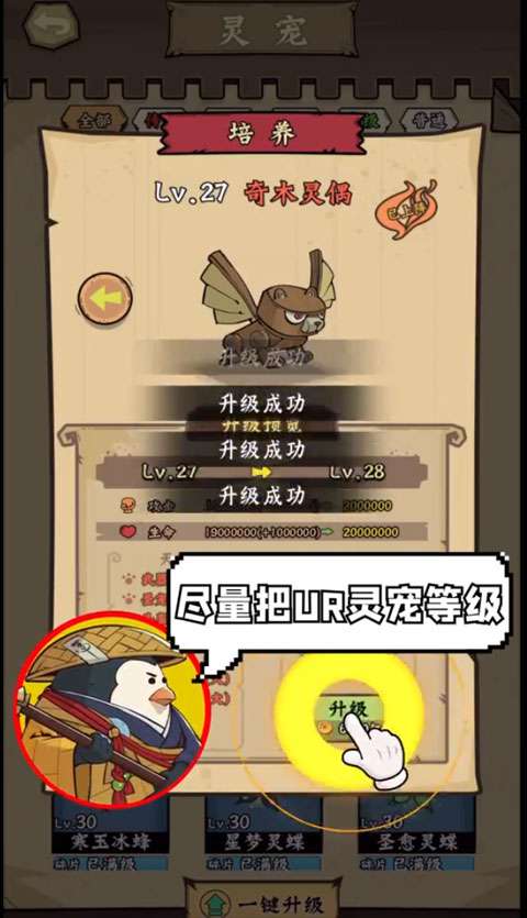 其余适当使用金币升级秘籍、灵宠和英雄;