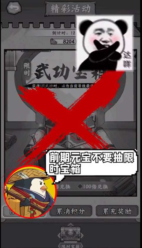1、玩家前期一定不要用元宝抽限时宝箱这里只会抽到重复的UR武功或灵宠。