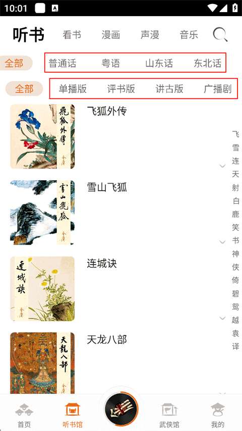 5、除了在首页搜索外,听书馆集成了各种书籍分类,从普通话到东北话,单播版到广播版,应有尽有;