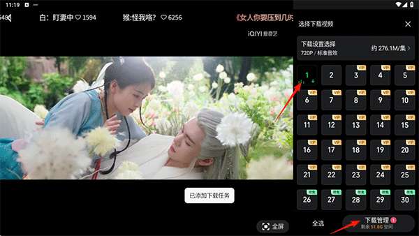 3、选择需要下载和缓存的剧集/问题,并在下面的下载管理中查看。