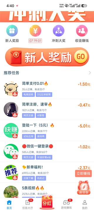 在首页可查看各种各样的任务都是标注了金额的简单完成即可快速积累收益。