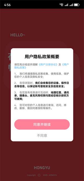 1、阅读用户注册协议和用户隐私政策之后点击同意并继续;