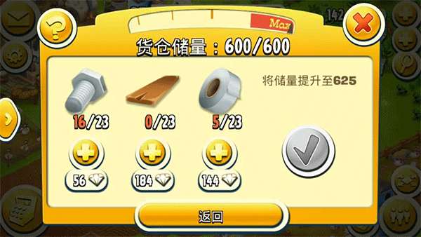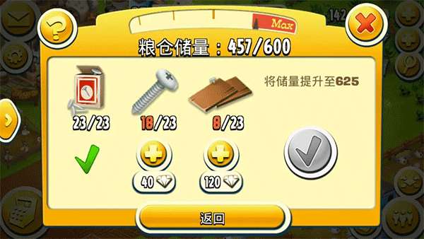 2、在卡通农场游戏里面想要获得等级的提升,虽然说金币和经验的获取是最重要的。但在同时玩家也需要得到一些基础建筑物的支撑,而仓库和粮 仓就是其中比较重要的两个。这两个建筑直接关系到玩家的存储数量,而提升的唯一手段就是升级。在升级的时候会消耗大量的建材, 所以获取建材道具就比较关键。
