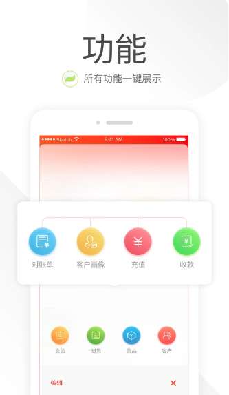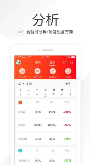 2、管好生意 进货、卖货、库存数据一目了然, 欠款、收入情况直接明了 统计分析帮助决策。