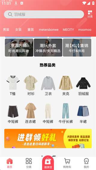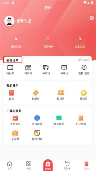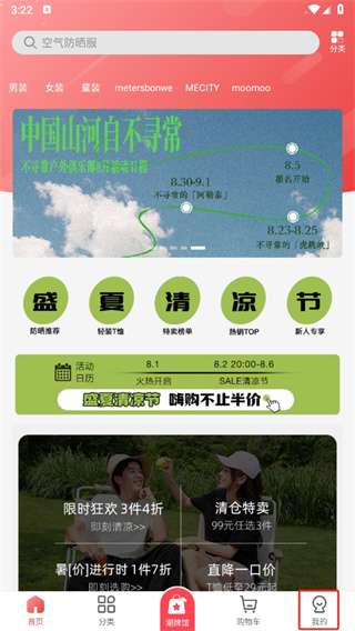 1、首先打开软件,进入到首页中后可以切换到分类、潮牌馆、购物车、我的页面,我们点击右下角的【我的】。