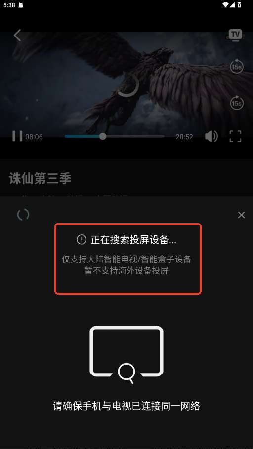 3、确保手机与电视连接在同一Wi-Fi网络下,系统将自动搜索可用设备,选择对应电视名称完成连接,即可进行大屏播放。