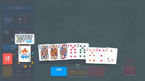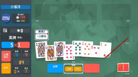6、每个回合,出牌与弃牌的次数均有一定限制。当出牌次数使用完毕后,若能获取300筹码,即可赢得该回合的胜利。