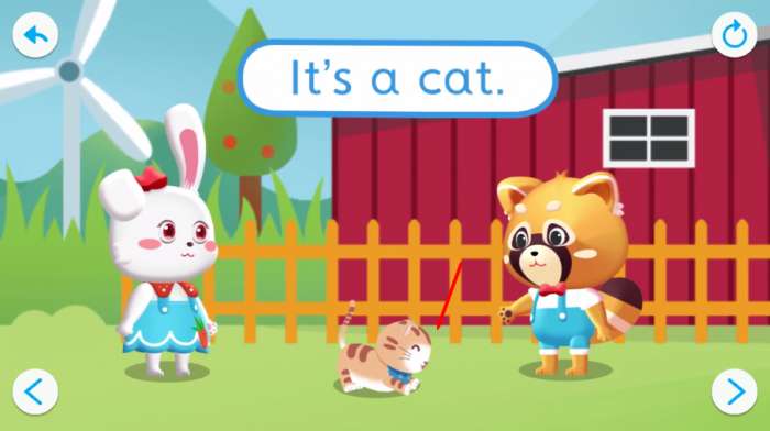 3、在学习过程中,第一个出现的单词是“cat”,结合例句“it’s a cat”,同时配有中文释义“这是一只猫”,帮助理解与记忆。