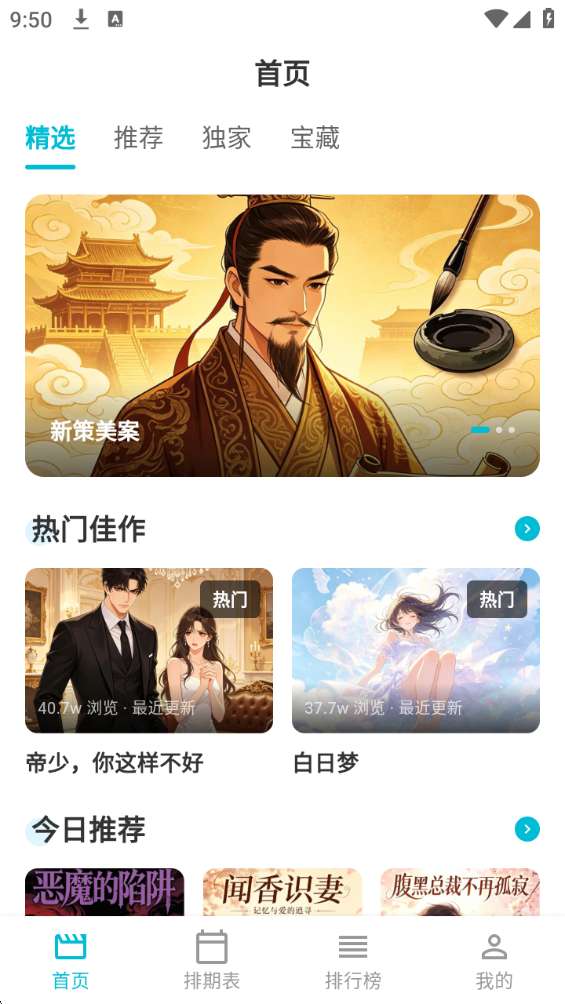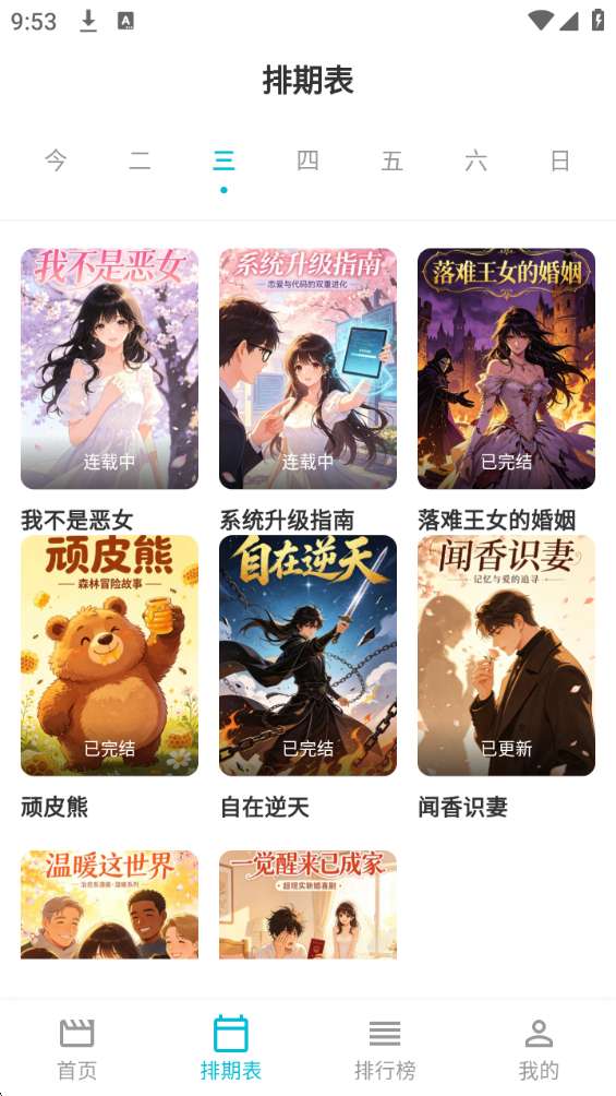 2、排期表:将每一天会有更新的漫画进行提示,让用户能够快速便捷的知道自己所追的小说何时更新。