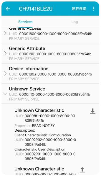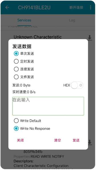 2、实时扫描蓝牙设备并显示信号强度,连接后自动枚举服务与特征值,支持特征值读写,支持notification开启和关闭。